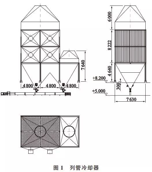 因窯頭的進(jìn)風(fēng)溫度大于250℃,超出了濾袋的耐溫參數(shù),需要在進(jìn)除塵器前增加一個(gè)能處理450000m3/h風(fēng)量并且風(fēng)溫降到小于180℃的列管冷卻器,見圖1。