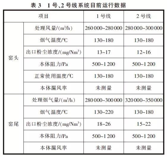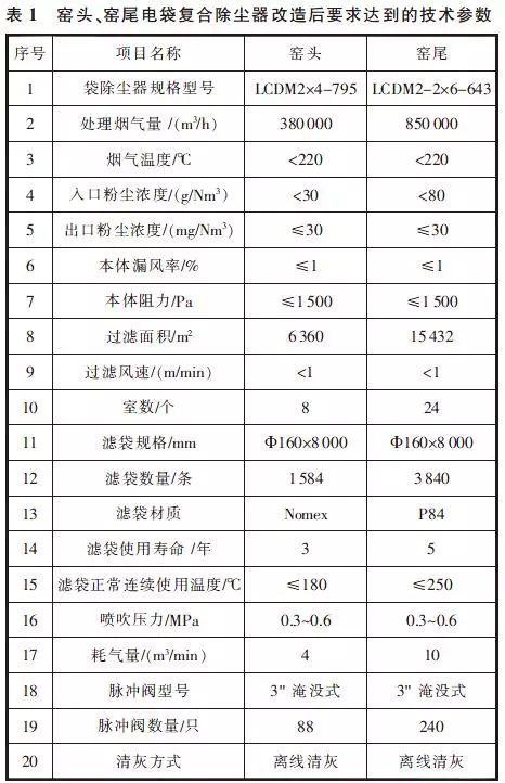 窯頭、窯尾電袋復(fù)合除塵器改造后要求達(dá)到的技術(shù)參數(shù)見表1。