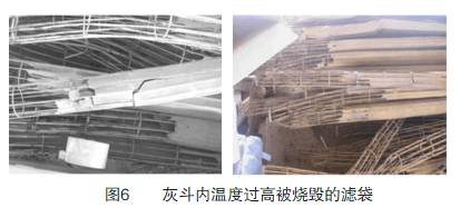 高溫粉塵被收入灰斗后,如果不能及時排出,粉塵會長期蓄積在灰斗里造成灰斗內溫度不斷升高,濾袋長期在高溫烘烤下就會變脆、變硬,嚴重時則會燒毀,尤其是粉塵中含有的易燃物質,會在灰斗內燃燒,從而燒毀濾袋(如圖6)。