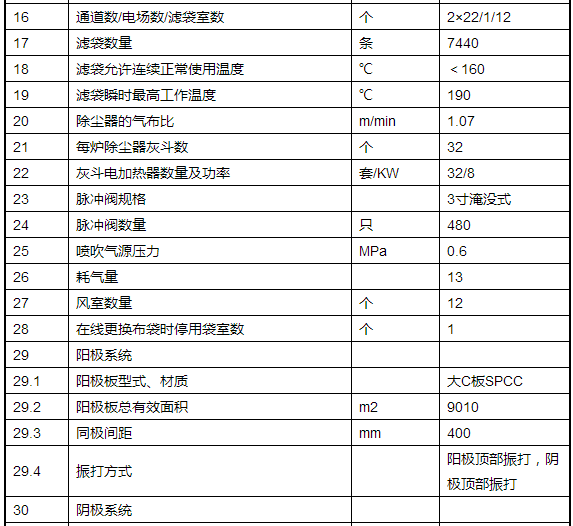 4 在原電除塵器的第二、三、四電場原立柱頂面水平鋪設花板,安裝濾袋、籠骨和噴吹系統,作為布袋除塵區。布袋除塵區每臺爐在寬度方向分為4列、每列分為3個室。每臺爐分24個清灰單元、共480個三寸脈沖閥、共7440條濾袋。布袋除塵采用外濾式,噴吹系統選用固定行噴吹清灰技術。每室1個人孔門,每個室之間相互獨立。在運行中如果某個室出現故障,關閉該室的離線閥、打開人孔門實現不停爐分室檢修(即可以實現不停爐進行更換布袋操作);也可以在運行時關閉某個室離線閥,實現離線清灰,保證清灰效果。
