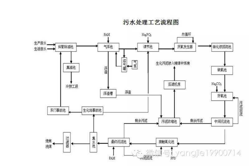 蒸氨廢水和經過水泵提升的無壓廢水,首先進入除油池,除去輕重油后自流入氣浮池。廢水在氣浮池中除去乳化油后進入調節池,以調節水量,均化水質。經過調節池的廢水再經提升泵送至厭氧反應器,進行水解酸化反應,以提高廢水的可生化性并降解部分有機物。厭氧反應器出水進入硝化液回流池并與從中沉池出水回流的消化液相混合,再經回流泵提升至缺氧池進行反硝化反應,將亞硝酸氮和硝酸氮還原為氮氣,并同時降解有機物。缺氧池出水進入好氧池進行脫碳和硝化反應,廢水在硝化池中首先大幅度降解有機物,然后將氨氮氧化為亞硝酸氮和硝酸氮。好氧出水進入中沉池,進入固液分離,上清液大部分回流。中沉池出水進入接觸氧化池進一步降解有機物,然后進入終沉池進行沉淀,出水經提升泵送至過濾器進行過濾,過濾器出水送至廠內回用。