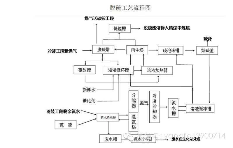由焦爐送來的80-83℃的荒煤氣,沿吸煤氣管道入氣液分離器。經氣液分離后,煤氣進入初冷器進行兩段間接冷卻;上段用32℃循環水冷卻煤氣,下段用16-18℃低溫水冷卻煤氣,使煤氣冷卻至22℃,然后經捕霧器入電捕焦油器除去懸浮的焦油霧后進入鼓風機,煤氣由鼓風機加壓送至脫硫工段。