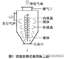 旋風(fēng)除塵器按氣流進(jìn)入方式分為切流轉(zhuǎn)式、軸流反轉(zhuǎn)式、直流式等。飼料行業(yè)除塵器所使用的主要是切流反轉(zhuǎn)式。其工作原理為:含塵氣體通過進(jìn)口起旋器產(chǎn)生旋轉(zhuǎn)氣流,進(jìn)入旋風(fēng)除塵器后,沿外壁自上而下作螺旋形旋轉(zhuǎn)運(yùn)動(dòng),這股向下旋轉(zhuǎn)的氣流到達(dá)錐體底部后,轉(zhuǎn)而向上,沿軸心向上旋轉(zhuǎn),其結(jié)構(gòu)見圖1。氣流作旋轉(zhuǎn)運(yùn)動(dòng)時(shí),塵粒在慣性離心力的作用下移向外壁,在氣流和重力共同作用下沿壁面落入灰斗,去除了粉塵的氣體匯向軸心區(qū)域由排氣芯管排出。